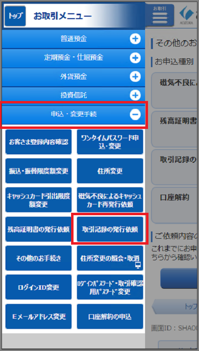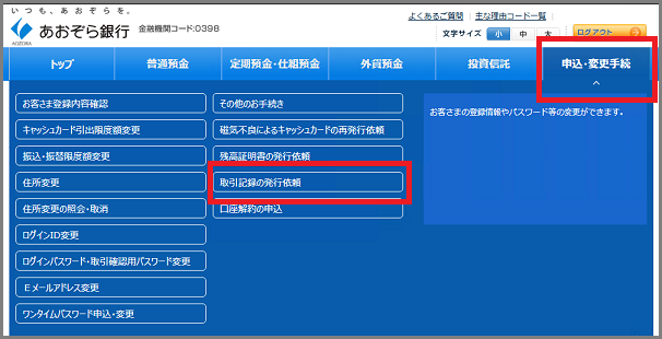 - インターネットバンキングやBANKアプリでは照会できない期間(過去3年以前、最長10年分)の入出金明細は、有料で書面発行にて取得可能です。本FAQの以下に記載の申し込み方法をご確認のうえ、お手続きください。なお、3年以内の入出金明細の照会・ダウンロード方法については、以下のよくあるご質問をご参照ください。インターネットバンキングにログインし、以下の手順でお申し込みください。<操作手順>1.インターネットバンキングにログイン2.「申込・変更手続」(※)を選択3.「その他のお手続き」を選択4.「取引記録の発行依頼」を選択5.画面の案内に従って手続きを完了してください※ スマートフォンの場合は、左上のお取引メニューから「申込・変更手続」にアクセスしてください。<画面イメージ>・スマートフォン・パソコンあおぞらホームコール(0120-250-399)にて必要書類をご請求のうえ、郵送でお申し込みください。【注意事項】・発行対象期間は過去10年分までです。・発行には手数料がかかります。詳細は「手数料一覧」の取引記録発行手数料をご確認ください。・書面のお届けまでの所要日数は以下の通りです。インターネットバンキングからのお申し込み:1週間~2週間程度郵送でのお申し込み:書類投函後、10日~2週間程度