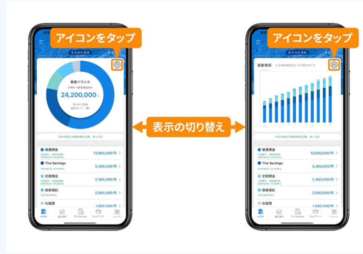 よくあるご質問 >BANKアプリ >Home >BANKアプリのHOME画面のグラフ種類の切り替え方を教えてください。