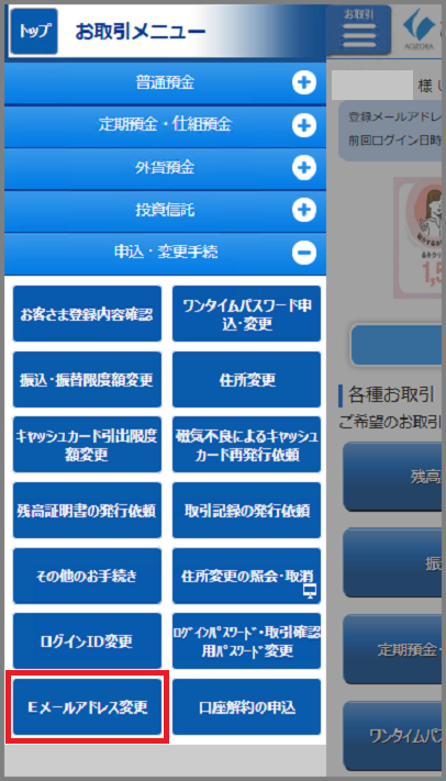 なお、スマートフォンでは「申込・変更手続」は、左上のお取引メニュー内にあります。