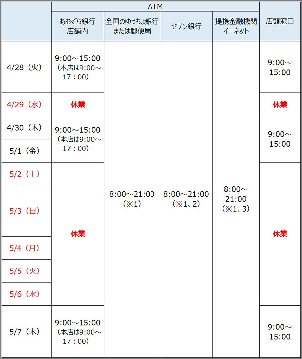 - 2026年4月28日(火)~2026年5月7日(木)の提携ATM、インターネットバンキング等のご利用時間については、以下のとおりです。