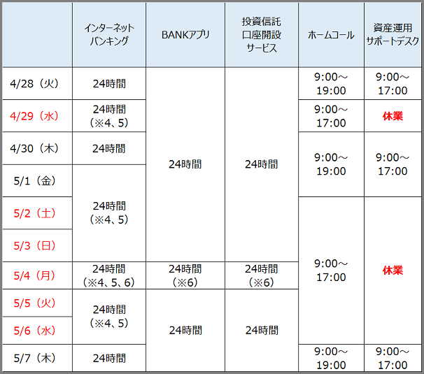 ※1 ATMの最長利用時間です。設置場所、店舗によってご利用時間が異なる場合があります。手数料や利用時間など詳しくはATM・キャッシュカード機能をご参照ください。※2 出金には所定の手数料がかかります。※3 提携金融機関・店舗によって、ご利用できる日時が異なる場合があります。出金には提携金融機関の定める利用手数料がかかります。詳しくは各金融機関にお問い合わせください。※4 5/1 15:00 ~ 5/6 23:59 にお手続きいただいた他行口座宛振込、一部のお取引については翌営業日(5/7)扱いとなります。※5 5/1 14:00 ~ 5/6 23:59 にお手続きいただいた投資信託の購入・解約のお取引については翌営業日(5/7)扱いとなります。※6 5/4 2:00 ~ 6:00 は定期メンテナンスのため、ご利用いただけません。