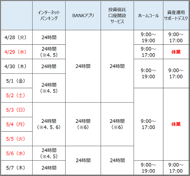 ※1 ATMの最長利用時間です。設置場所、店舗によってご利用時間が異なる場合があります。手数料や利用時間など詳しくはATM・キャッシュカード機能をご参照ください。※2 出金には所定の手数料がかかります。※3 提携金融機関・店舗によって、ご利用できる日時が異なる場合があります。出金には提携金融機関の定める利用手数料がかかります。詳しくは各金融機関にお問い合わせください。※4 5/1 15:00 ~ 5/6 23:59 にお手続きいただいた他行口座宛振込、一部のお取引については翌営業日(5/7)扱いとなります。※5 5/1 14:00 ~ 5/6 23:59 にお手続きいただいた投資信託の購入・解約のお取引については翌営業日(5/7)扱いとなります。※6 5/3~5 2:00 ~ 6:00 は定期メンテナンスのため、ご利用いただけません。